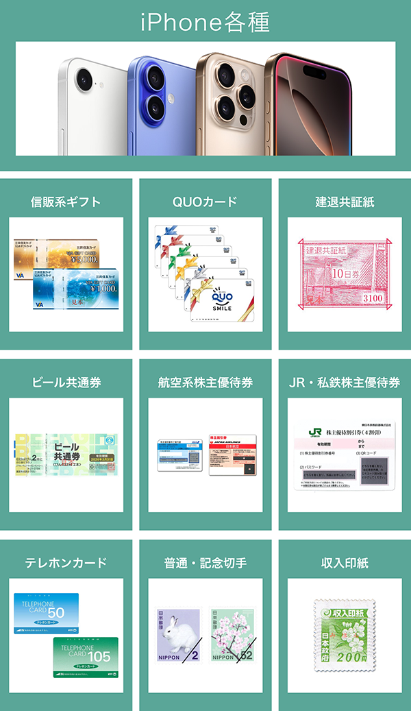 信販系ギフト・JCBやVJAなどのギフトカード・QUOカード・ビール共通券・テレホンカード・普通切手・記念切手・収入印紙・建退共証紙・航空会社や鉄道会社の株主優待券・iPhone各種が対象です。