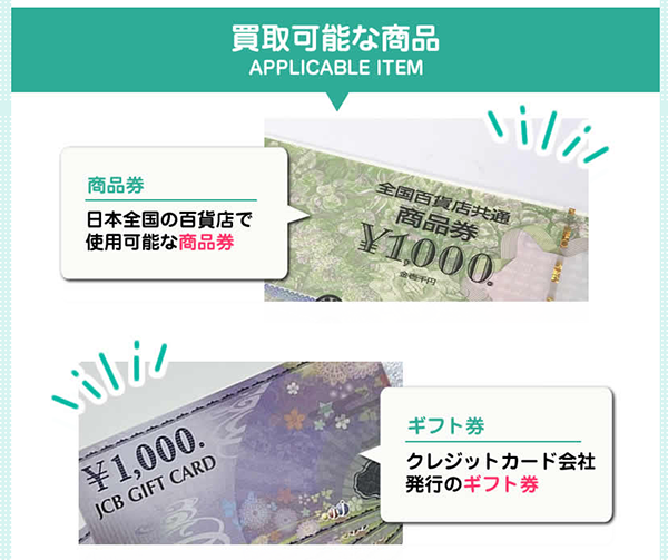 | 買取対象商品 | 全国百貨店共通商品券 ギフト券 |