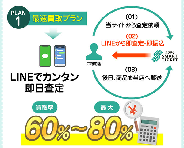 SMART TICKET(スマチケ)の最速買取プラン(先払い買取)はLINE完結ですべての手続ができる先払い買取サービスです。