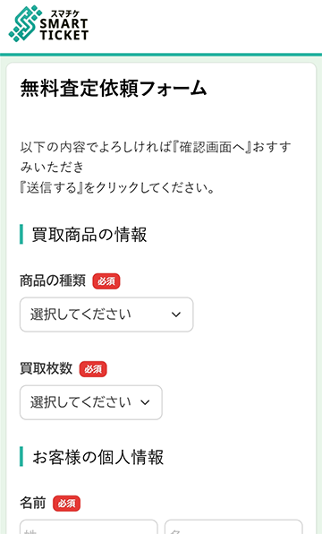 SMART TICKET(スマチケ)の公式サイトにある無料買取査定はこちらからのボタンをタップして無料査定依頼フォームへ移動します。