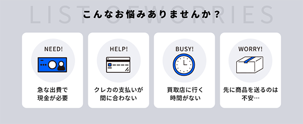 リフチケは、「急な出費で現金が必要」「クレカの支払いが間に合わない」「買取店に行く時間がない」「先に商品を送るのは不安⋯」そんなときに、スマホひとつで手軽に現金化できるサービスです。
